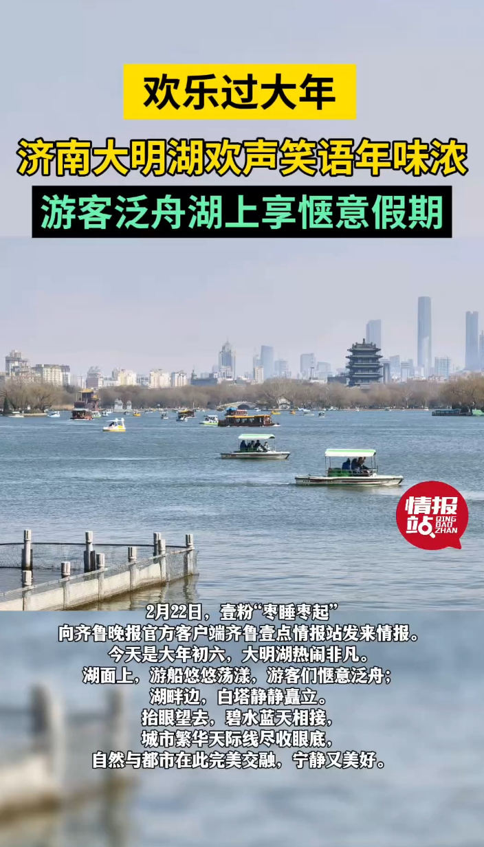 壹粉过大年|济南大明湖欢声笑语年味浓,游客泛舟湖上享惬意假期齐鲁壹点 | 02-22 大众报业·齐鲁壹点 微信扫码扫码下载客户端2月22日,壹粉“枣睡枣起”向齐鲁晚报官方客户端齐鲁壹点情报站发来情报。今天是大年初六,大明湖热闹非凡。湖面上,游船悠悠荡漾,游客们惬意泛舟;湖畔边,白塔静静矗立。抬眼望去,碧水蓝天相接,城市繁华天际线尽收眼底,自然与都市在此完美交融,宁静又美好。