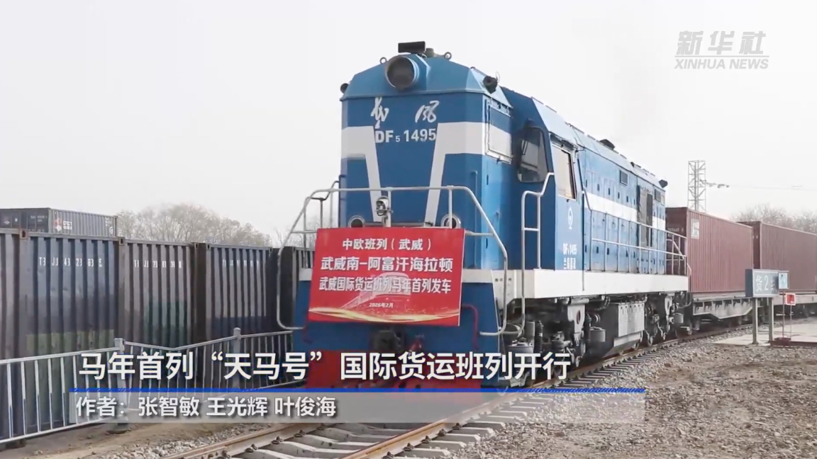 马年首列“天马号”国际货运班列开行新华社 02-222月21日,满载55个集装箱货物的75188次“天马号”国际货运班列从武威南站鸣笛启程,驶向哈萨克斯坦、乌兹别克斯坦、吉尔吉斯斯坦、塔吉克斯坦、阿富汗五国,这是甘肃省武威市马年开行的首列国际货运班列。
