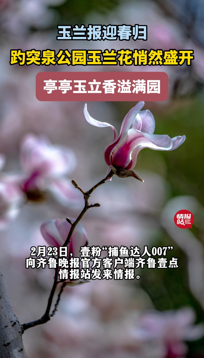 壹粉过大年|趵突泉公园玉兰花悄然盛开,亭亭玉立香溢满园!齐鲁壹点 | 02-23 大众报业·齐鲁壹点 微信扫码扫码下载客户端2月23日,壹粉“捕鱼达人007”向齐鲁晚报官方客户端齐鲁壹点情报站发来情报。趵突泉公园的玉兰花悄然盛开,满树望春玉兰竞相绽放。洁白花瓣配着紫红色花托,清雅动人。游人如织的泉畔花园里,花儿亭亭玉立、明艳亮眼,引得游客纷纷驻足拍照,为春日的趵突泉添上一抹温柔别致的风景。