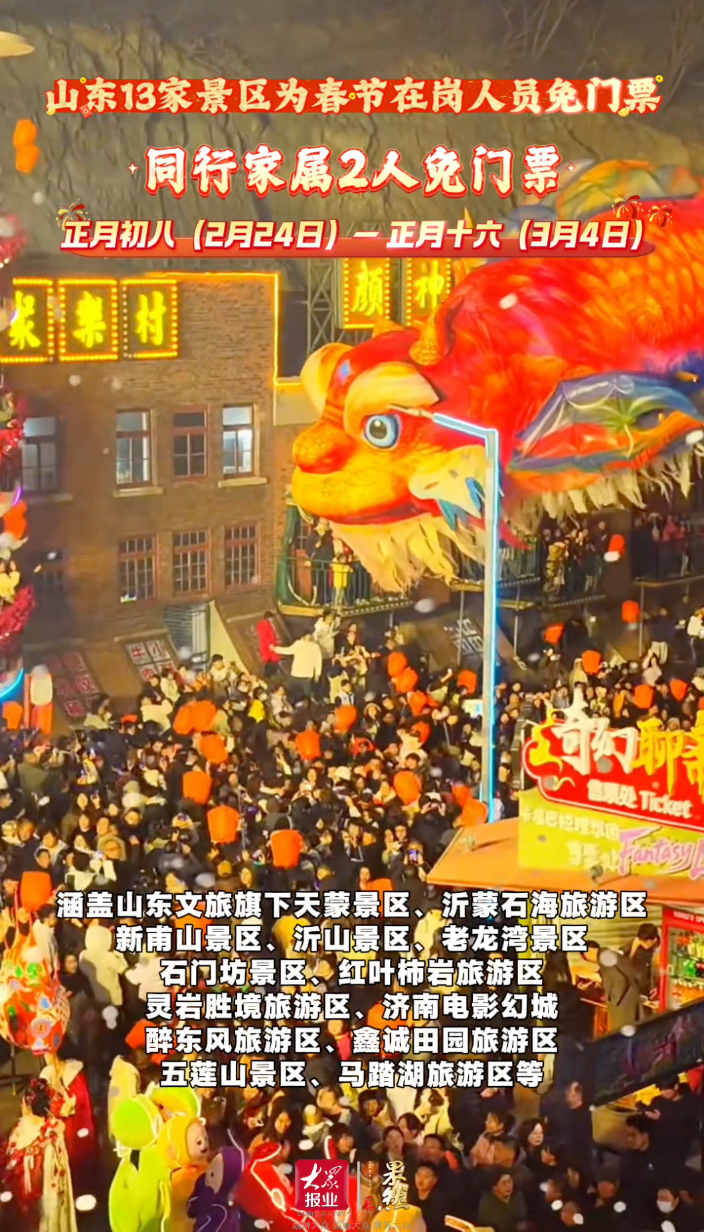 果然视频|正月初八起,山东13家景区为春节在岗人员免门票 大众报业·齐鲁壹点 昨天11:31正月初八至正月十六,山东文旅旗下13家景区暖心开放,向春节期间在岗人员免门票,同行2位家属同享免票福利。涵盖天蒙、沂蒙石海、新甫山、沂山、老龙湾、石门坊、红叶柿岩、灵岩胜境、济南电影幻城、醉东风、鑫诚田园、五莲山、马踏湖等景区,把春光还给春节在岗坚守者。(齐鲁晚报·齐鲁壹点记者 孙远明 王昕珂)
