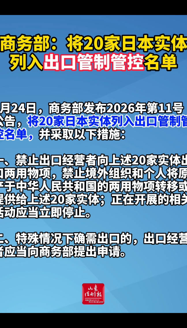 2月24日,商务部发布2026年第11号公告,将20家日本实体列入出口管制管控名单,并采取以下措施: