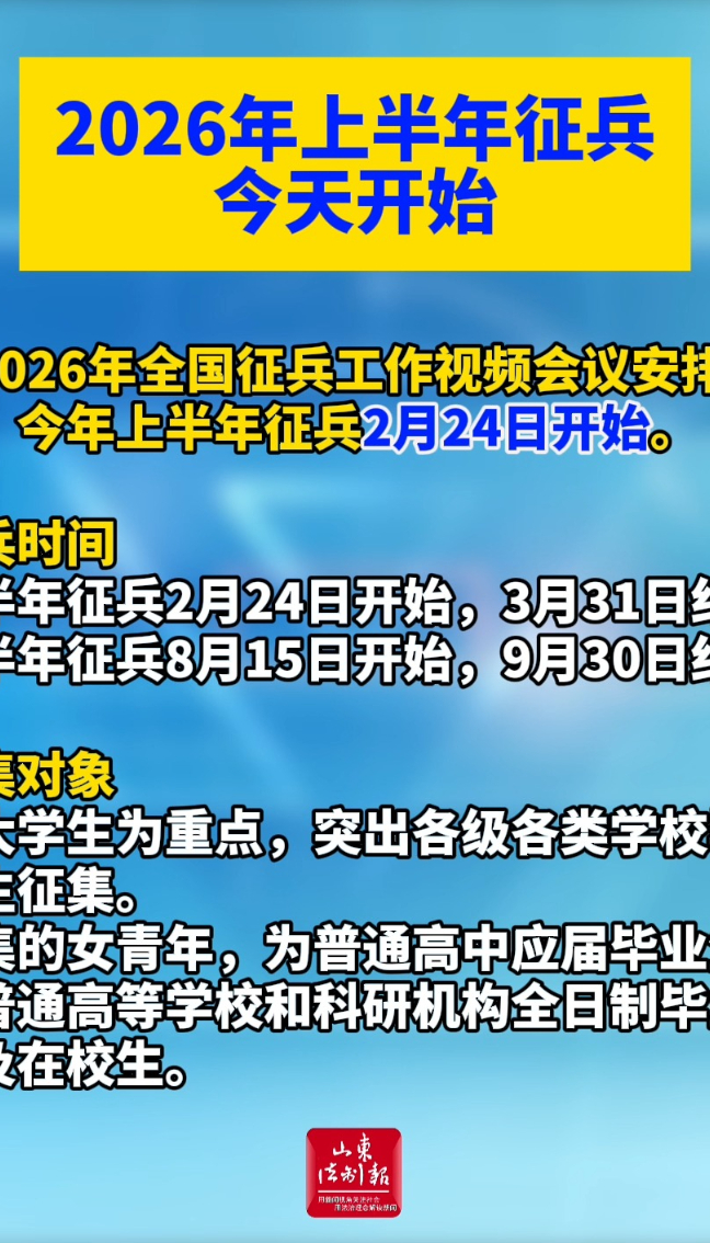 据2026年全国征兵工作视频会议安排部署,今年上半年征兵2月24日开始。