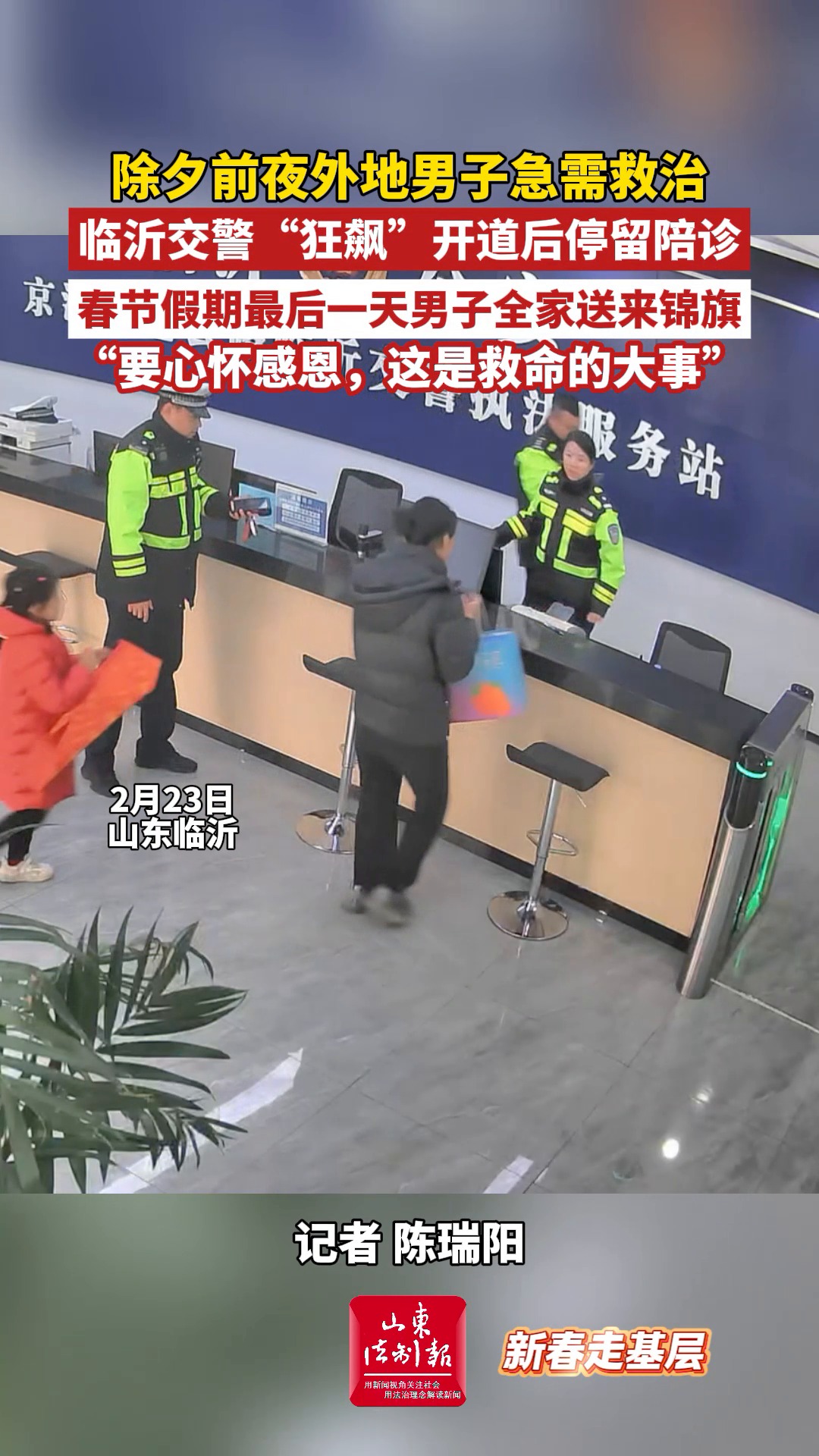 除夕前夜外地男子急需救治,临沂交警“狂飙”开道后停留陪诊,春节假期最后一天男子全家送来锦旗