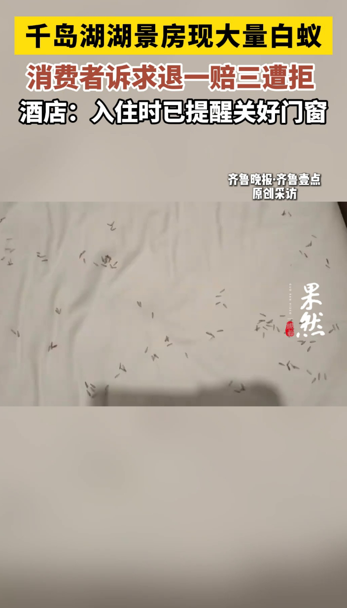 果然视频|千岛湖湖景房现大量白蚁,消费者要求退一赔三遭拒齐鲁晚报·齐鲁壹点客户端 昨天17:19原创2月24日,消费者王女士(化名)向齐鲁晚报·齐鲁壹点反映,其入住的千岛湖某度假酒店的房间内出现大量白蚁,严重影响居住安全,她提出退一赔三,诉求却被酒店拒绝,目前双方仍就赔偿事宜协商未果。