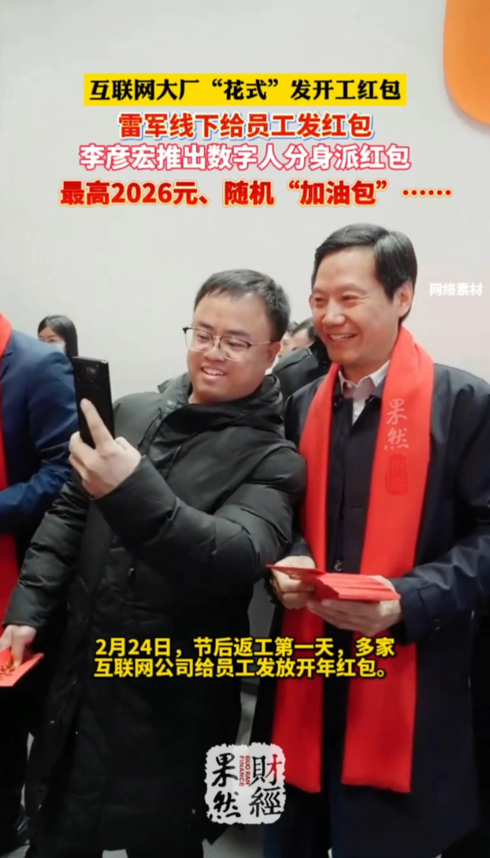 正月初八,互联网大厂纷纷开启复工模式,同步派发开工红包暖场鼓劲。小米创始人雷军带领高管团队为员工发红包送祝福;腾讯为中国内地本部正式员工、实习生等全员发放400元固定红包及随机加油包;快手对正式员工、实习生分别发放366元、200元红包;百度以李彦宏数字人形象,为正式员工派发随机金额红包、实习生发放188元红包;淘天集团则为员工送上刮刮乐和毛绒公仔。