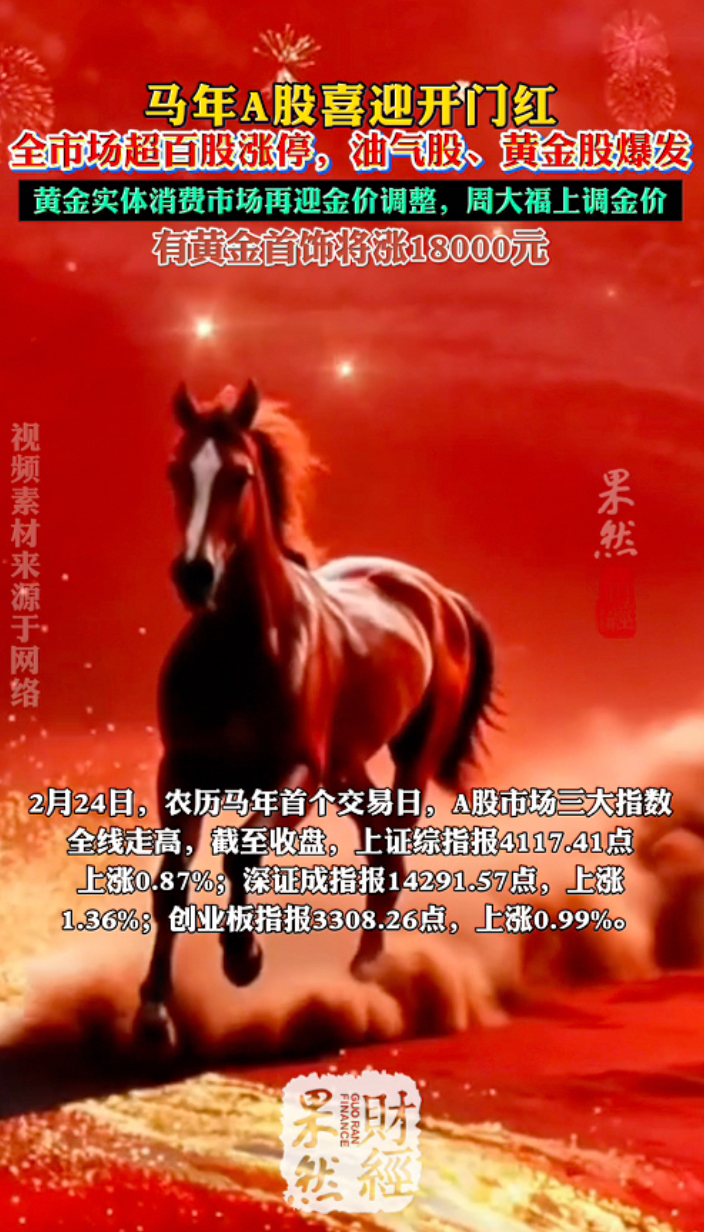 果然财经|A股马年开门红,油气股、黄金股爆发 昨天17:20 原创齐鲁晚报·齐鲁壹点客户端 微信扫码扫码下载客户端2月24日,农历马年首个交易日,A股市场三大指数全线走高,截至收盘,上证综指报4117.41点,上涨0.87%;深证成指报14291.57点,上涨1.36%;创业板指报3308.26点,上涨0.99%。在市场交投方面,全天成交额显著放大,沪深两市合计成交额达2.22万亿元,较前一交易日增量2192亿元,显示增量资金入场迹象明显。