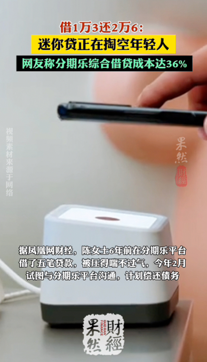 果然财经|借1万3还2万6:迷你贷正在掏空年轻人 昨天17:20 原创齐鲁晚报·齐鲁壹点客户端 微信扫码扫码下载客户端近日,分期乐因“400元分36期”“1万3要还2万6”的惊人高息登上微博热搜。据凤凰网财经,陈女士6年前在分期乐平台借了五笔贷款,被压得喘不过气,今年2月试图与分期乐平台沟通,计划偿还债务。但她累计借款13674元,却需还款26859元,接近本金的两倍。逼近36%的年化利率,让她身心俱疲。