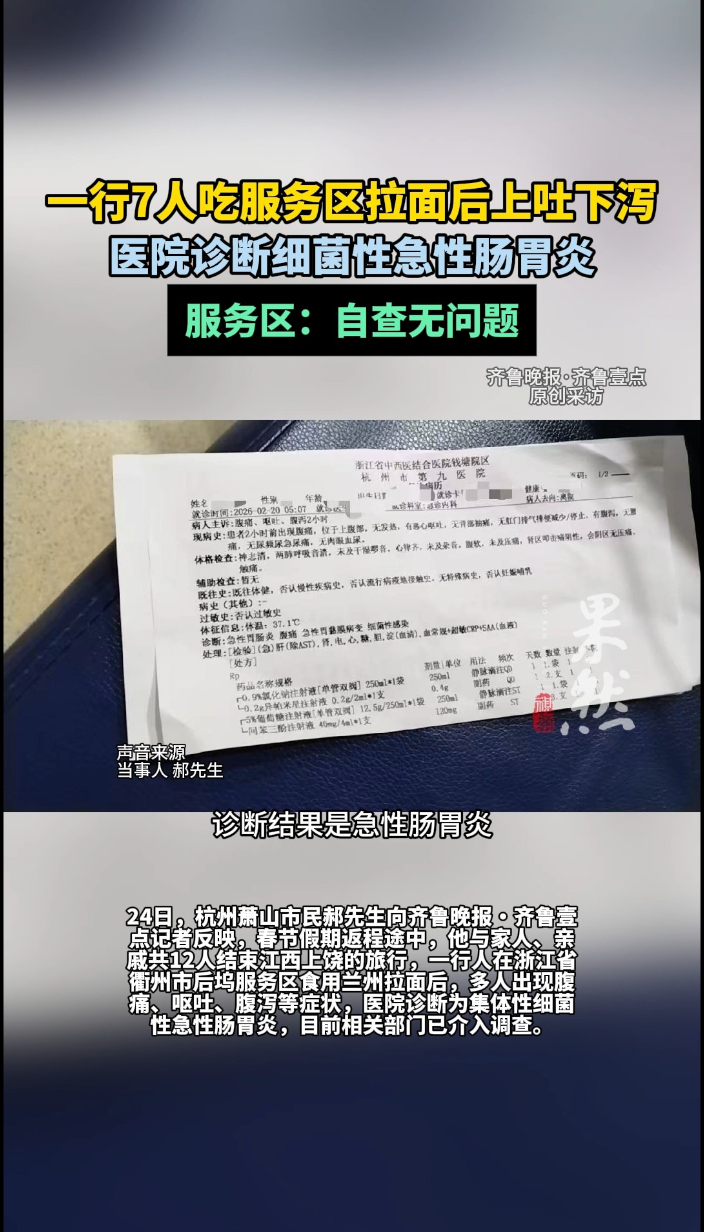 果然视频|一行7人吃服务区拉面后上吐下泻,服务区回应:自查没问题 昨天17:20 原创齐鲁晚报·齐鲁壹点客户端 微信扫码扫码下载客户端2月24日,杭州萧山市民郝先生向齐鲁晚报・齐鲁壹点记者反映,春节假期返程途中,一行人在高速服务区食用兰州拉面后,多人出现腹痛、呕吐、腹泻等症状,医院诊断为集体性细菌性急性肠胃炎,目前相关部门已介入调查。(齐鲁晚报·齐鲁壹点记者 崔可腾 周静)