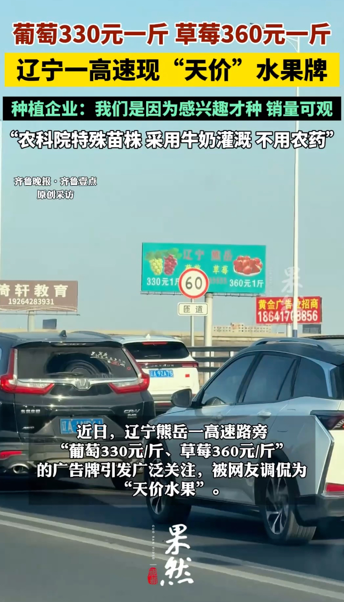 果然视频|草莓一斤360块,辽宁一高速现“天价”水果牌齐鲁晚报·齐鲁壹点客户端 昨天17:31原创近日,辽宁熊岳一高速路旁“葡萄330元/斤、草莓360元/斤”的广告牌引发广泛关注,被网友调侃为“天价水果”。(齐鲁晚报·齐鲁壹点爆料电话:0531-85193656;邮箱:405617016@qq.com)(齐鲁晚报·齐鲁壹点 杜嘉文)