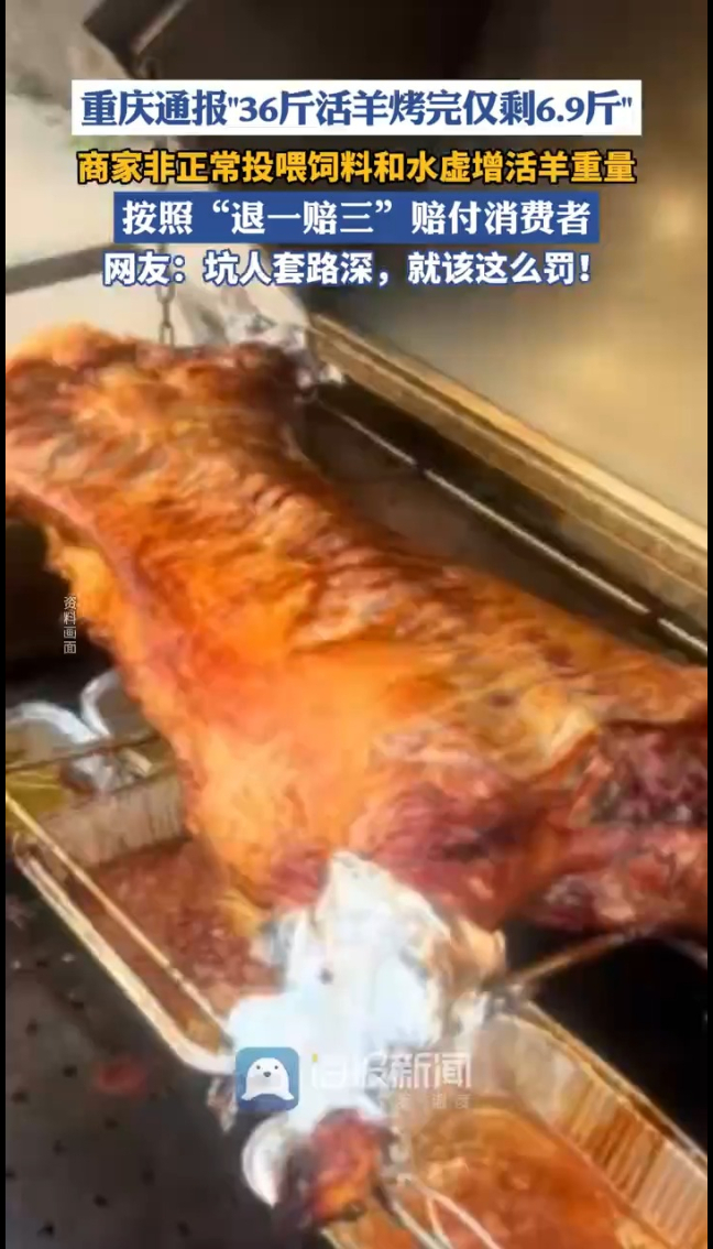 重庆南岸区一家烤全羊店翻车了。有消费者投诉,自己选的36斤活羊,宰杀前还特意给羊腿、羊尾做了标记,结果烤完上桌只剩6.9斤。消费者当场傻眼:这“缩水”也太狠了吧?