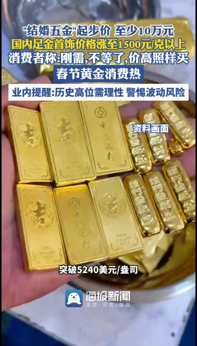 2月24日早盘,现货黄金突破5240美元/盎司,国内金饰价格也跟着水涨船高,像周生生足金报价已经到了1550元一克。价格是高,但大家的购买热情一点没减。湖南长沙有金店店长就说,今年春节金价1588元一克,一套五金至少10万。