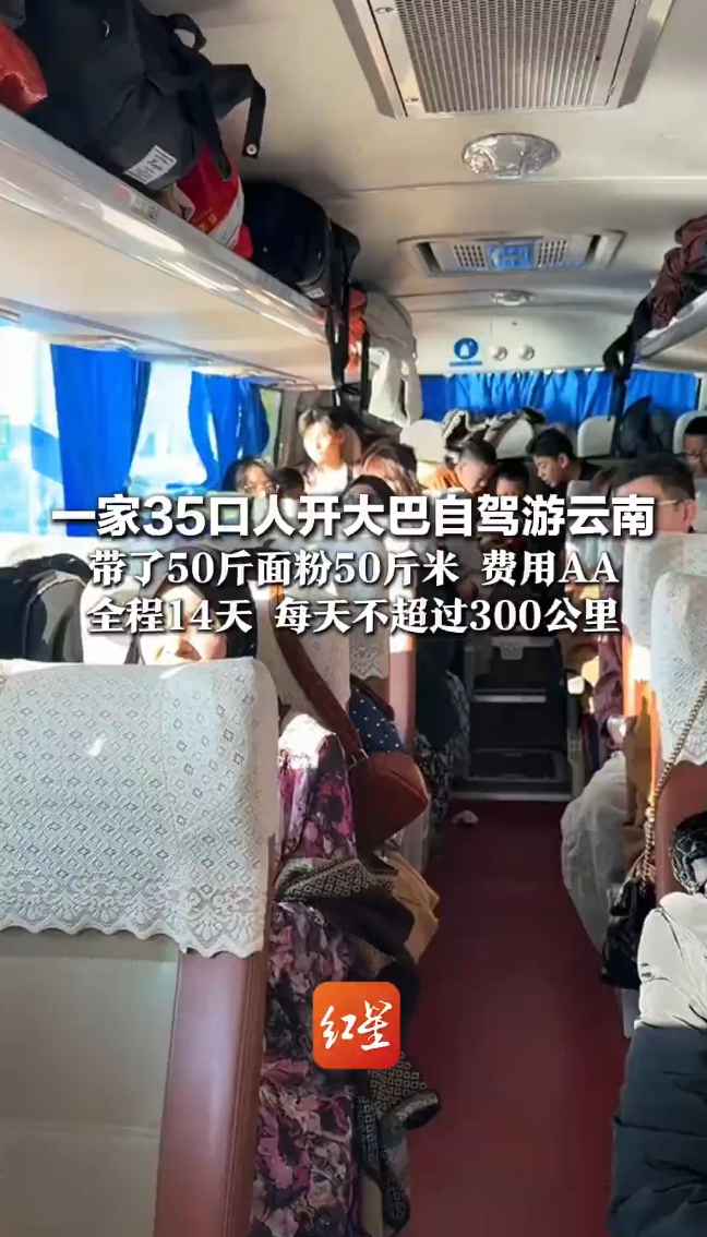 一家三代35人的“春节大巴”:14天自驾6000公里,家人间收获更多理解和关爱红星新闻 07:142月7日出发,2月20日返家,14天的旅程。青海-甘肃-四川-云南-贵州-重庆-四川-甘肃-青海大环线,全程6000余公里。这是赵霞一大家人的“春节大巴”,老少三代,35口人,其中包括17名孩子、7位老人,年龄最小的6岁,最大的75岁。