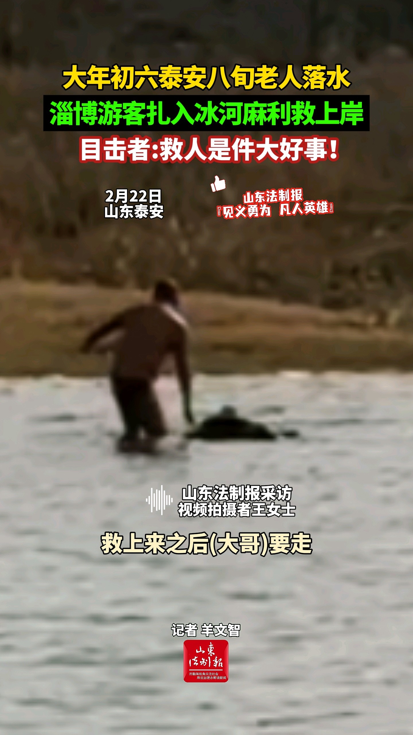 大年初六泰安八旬老人落水,淄博游客扎入冰河麻利救上岸,目击者:救人是件大好事!山东法制报 | 16:22 原创山东法制报 微信扫码扫码下载客户端2月22日下午,泰安岱岳区大汶口古石桥附近,一位八旬老人不慎落水。一名淄博游客发现后,纵身跃入刺骨冰河,迅速将老人救上岸。确认老人无大碍后,他便转身默默离开。(大众新闻·山东法制报记者 羊文智)