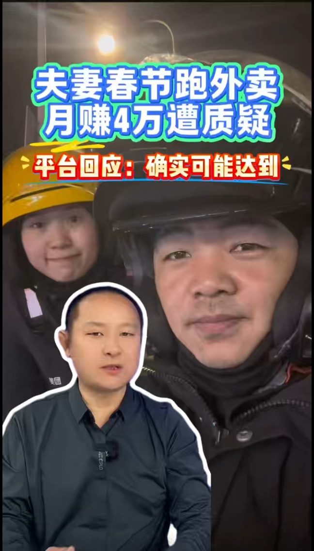 半岛时评| “夫妻春节跑外卖月赚4万”遭质疑,平台回应“确实可能达到”半岛新闻 | 17:18 原创大众新闻·海报新闻 微信扫码扫码下载客户端半岛时评| “夫妻春节跑外卖月赚4万”遭质疑,平台回应“确实可能达到”