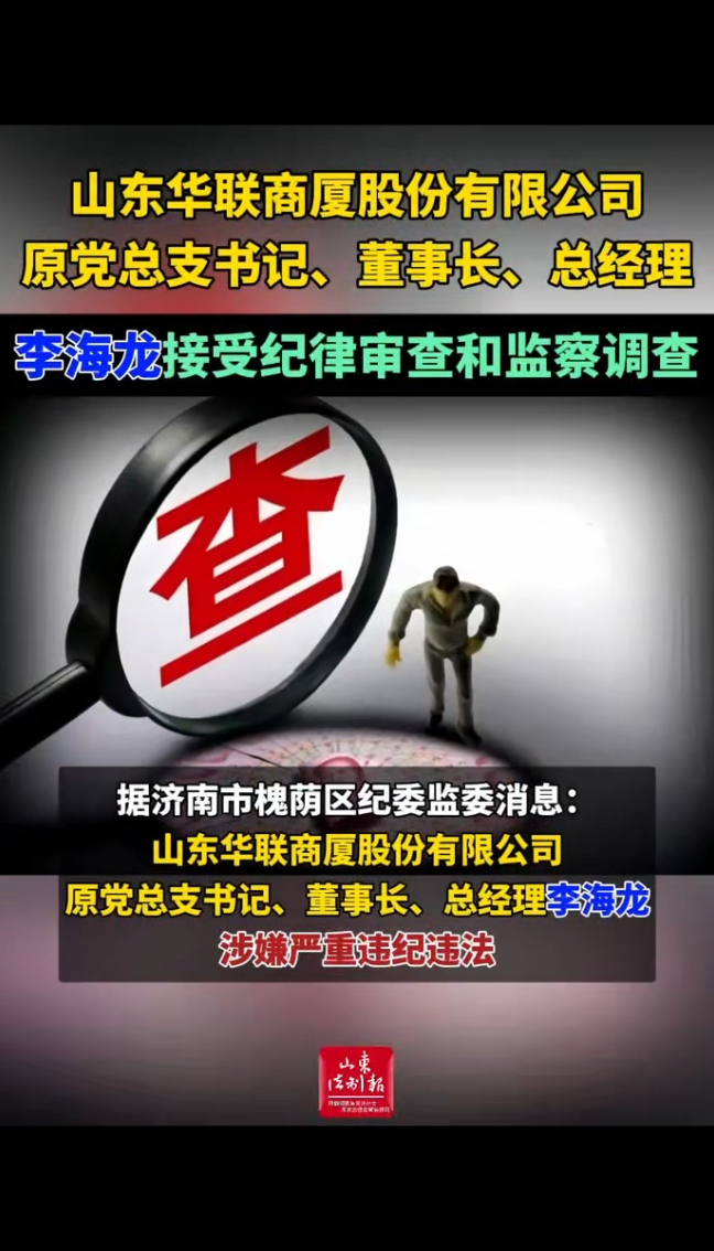 山东华联商厦股份有限公司原党总支书记、董事长、总经理李海龙接受纪律审查和监察调查山东法制报 | 16:21 现场山东省纪委监委网站 微信扫码扫码下载客户端据济南市槐荫区纪委监委消息:山东华联商厦股份有限公司原党总支书记、董事长、总经理李海龙涉嫌严重违纪违法,经济南市纪委监委指定管辖,目前正接受济南市槐荫区纪委监委纪律审查和监察调查。