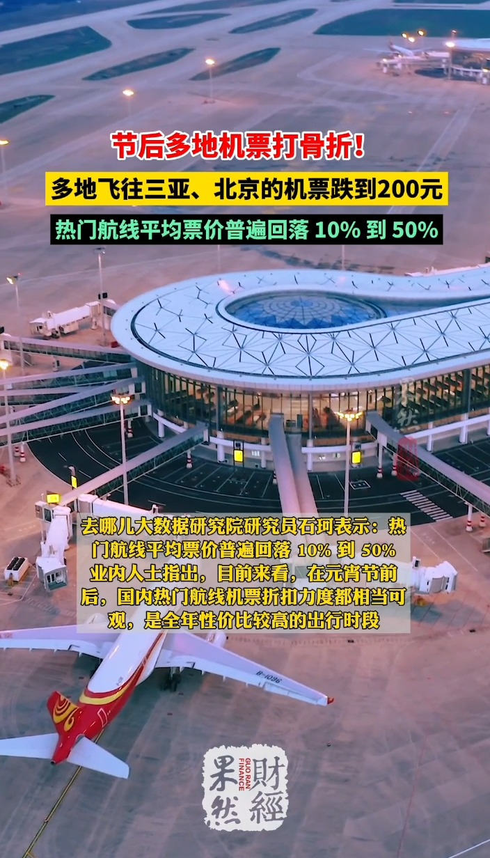 果然财经|节后热门航线平均票价普遍回落10%到50%齐鲁壹点 | 15:48 原创齐鲁晚报·齐鲁壹点客户端 微信扫码扫码下载客户端据央视财经报道,订票平台数据显示,春节假期后,上海至北京、三亚、哈尔滨、西双版纳等多条航线推出折扣机票,单程票价低至 200 元。北京飞往三亚、广州飞往北京的机票价格均在 400 元左右。