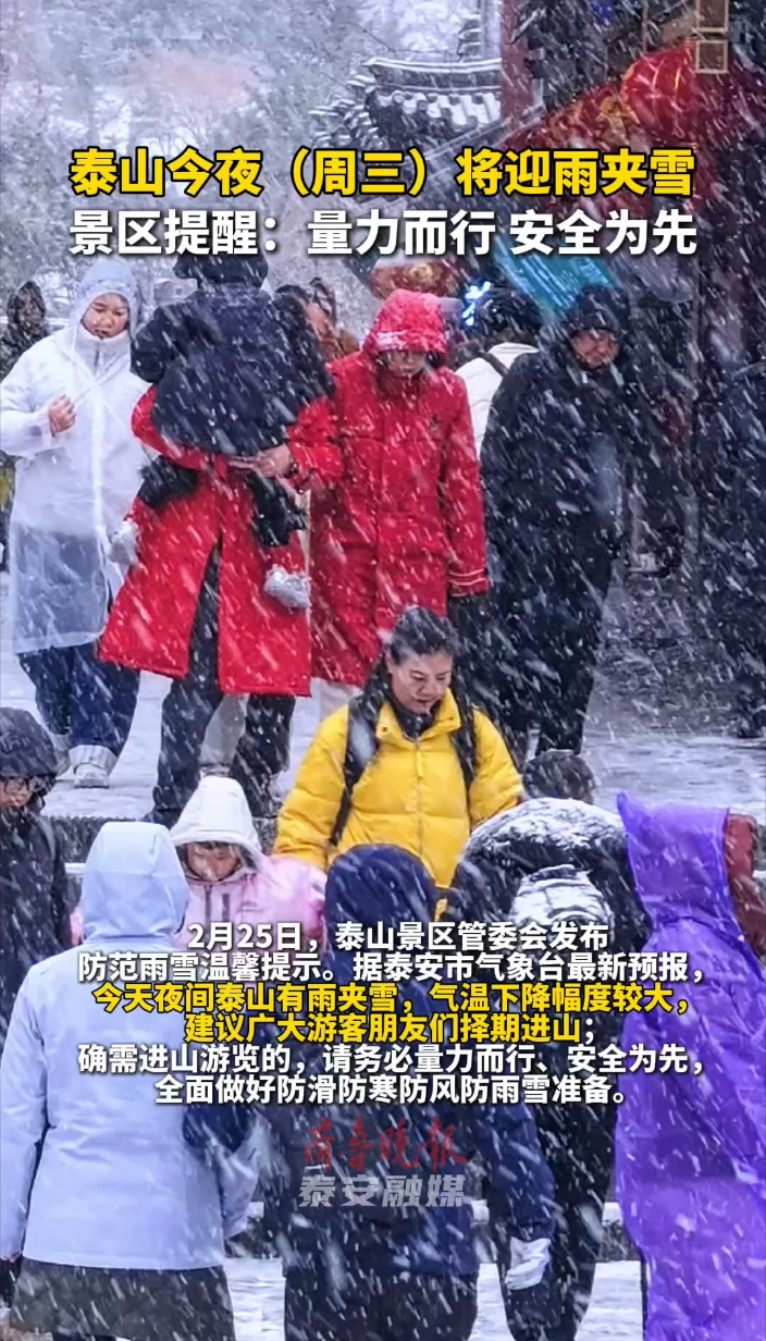 果然视频|今夜(周三)泰山有雨夹雪,建议游客择期进山齐鲁晚报·齐鲁壹点客户端 15:39原创2月25日,泰山景区管委会发布防范雨雪温馨提示。据泰安市气象台最新预报,今天夜间泰山有雨夹雪,气温下降幅度较大,建议广大游客朋友们择期进山;确需进山游览的,请务必量力而行、安全为先,全面做好防滑防寒防风防雨雪准备。 雪景虽美,安全更重!雪后泰山,天寒风大、道路湿滑,如遇冰冻、暴雪、大风等恶劣天气,请尽量避免户外活动,并配合工作人员指引尽快避险,有序下山或入住宾馆,谨慎慢行、确保安全!