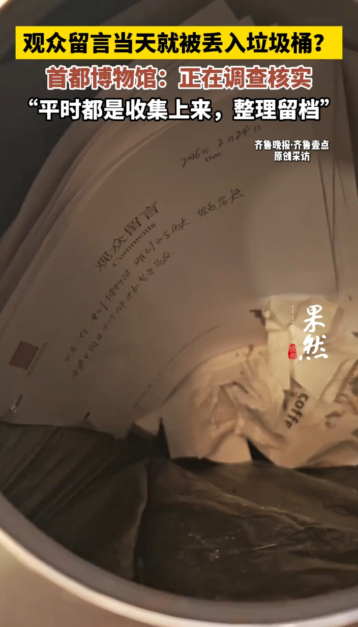果然视频|观众留言当天就被丢入垃圾桶?首都博物馆回应齐鲁晚报·齐鲁壹点客户端 16:26原创2月24日,有网友发布视频称,首都博物馆将当天的观众纸质留言丢进了垃圾桶,引发网友热议。在网友提供的视频中显示,在一个不锈钢的垃圾桶里,一沓写有“观众留言”的纸被丢在里面,上面能清晰看到“2026年2月24日”的字样,网友感慨“这观众留言就这么被扔了”。