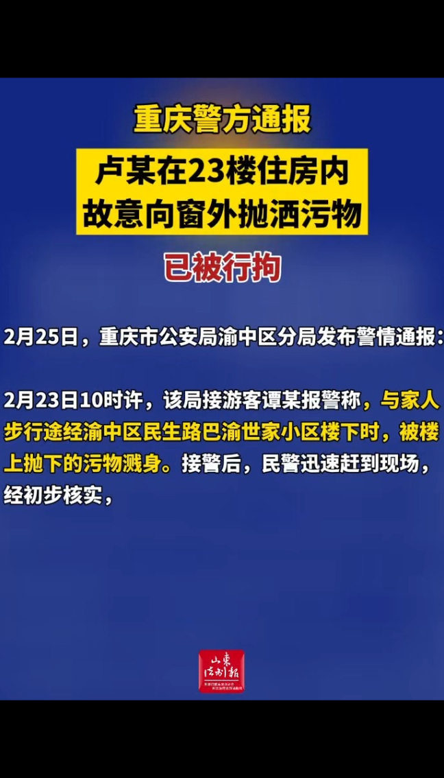 重庆警方通报:卢某在23楼住房内故意向窗外抛洒污物,已被行拘