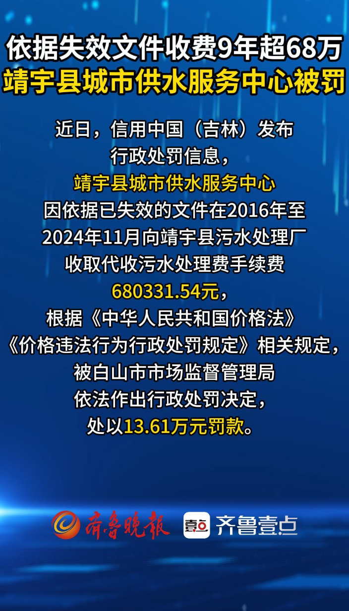 依据失效文件收费9年超68万 靖宇县城市供水服务中心被罚大众报业·齐鲁壹点 17:40近日,信用中国(吉林)发布行政处罚信息,靖宇县城市供水服务中心因依据已失效的文件在2016年至2024年11月向靖宇县污水处理厂收取代收污水处理费手续费680331.54元,根据《中华人民共和国价格法》《价格违法行为行政处罚规定》相关规定,被白山市市场监督管理局依法作出行政处罚决定,处以13.61万元罚款。