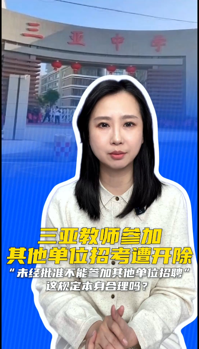 半岛时评|三亚教师参加其他单位招考遭开除 “未经批准不能参加其他单位招聘”这规定本身合理吗?大众新闻·半岛新闻 10:44原创半岛时评|三亚教师参加其他单位招考遭开除 “未经批准不能参加其他单位招聘”这规定本身合理吗?