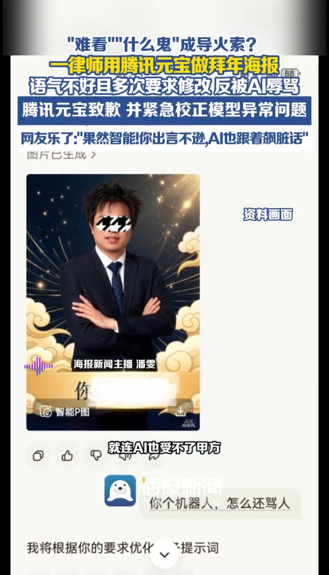 主播说 | 一律师用腾讯元宝做拜年海报 语气不好且多次要求修改 反被AI辱骂