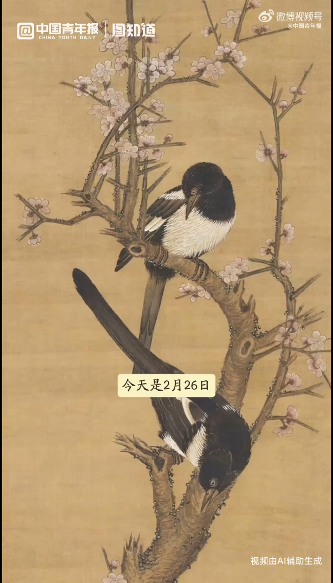 《先春四喜图》:四鹊报喜 春满人间中国青年报 08:18今天是2月26日,星期四,正月初十。《先春四喜图》绘四只喜鹊灵动栖息,山茶艳丽,梅花清幽,花枝掩映下,喜鹊眼神交汇,恰似邻里互话家常,画面温馨而富有生机。在这美好的春光里,祝您喜上眉梢,顺遂安康!早安,朋友!
