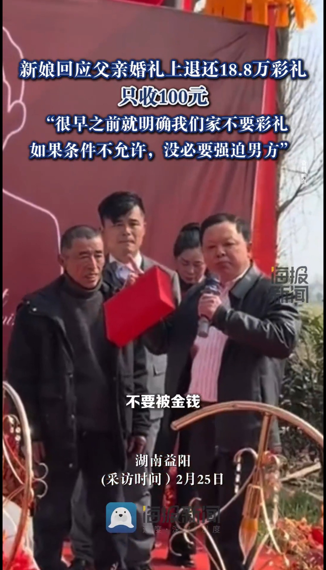新娘回应“父亲婚礼上退还18.8万彩礼只收100元”:很早之前就明确我们家不要彩礼