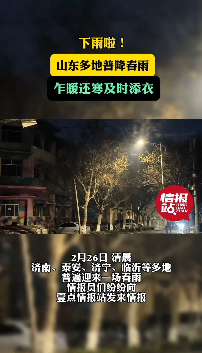 天气情报站|下雨啦!山东多地普降春雨,乍暖还寒及时添衣齐鲁壹点 | 08:41 大众报业·齐鲁壹点 微信扫码扫码下载客户端2月26日,清晨,济南、泰安、济宁、临沂等多地普遍迎来一场春雨,情报员们纷纷向壹点情报站发来情报,一场喜雨降至,对小麦生长有着极大的好处,同时提醒市民朋友,春天乍暖还寒请及时添衣。