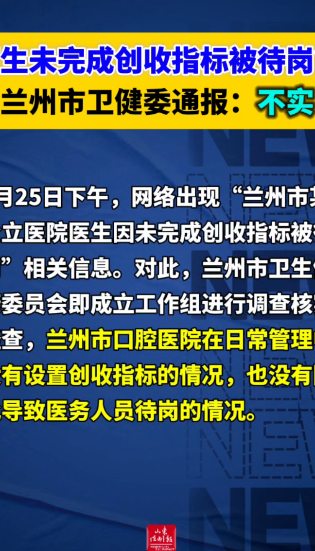 医生未完成创收指标被待岗?兰州市卫健委通报:不实 15:49 大众新闻·山东法制报 微信扫码扫码下载客户端2月26日,兰州市卫生健康委员会发布关于“兰州市某公立医院医生因未完成创收指标被待岗”调查情况通报:2月25日下午,网络出现“兰州市某公立医院医生因未完成创收指标被待岗”相关信息。对此,兰州市卫生健康委员会即成立工作组进行调查核实。经查,兰州市口腔医院在日常管理中没有设置创收指标的情况,也没有因此导致医务人员待岗的情况。