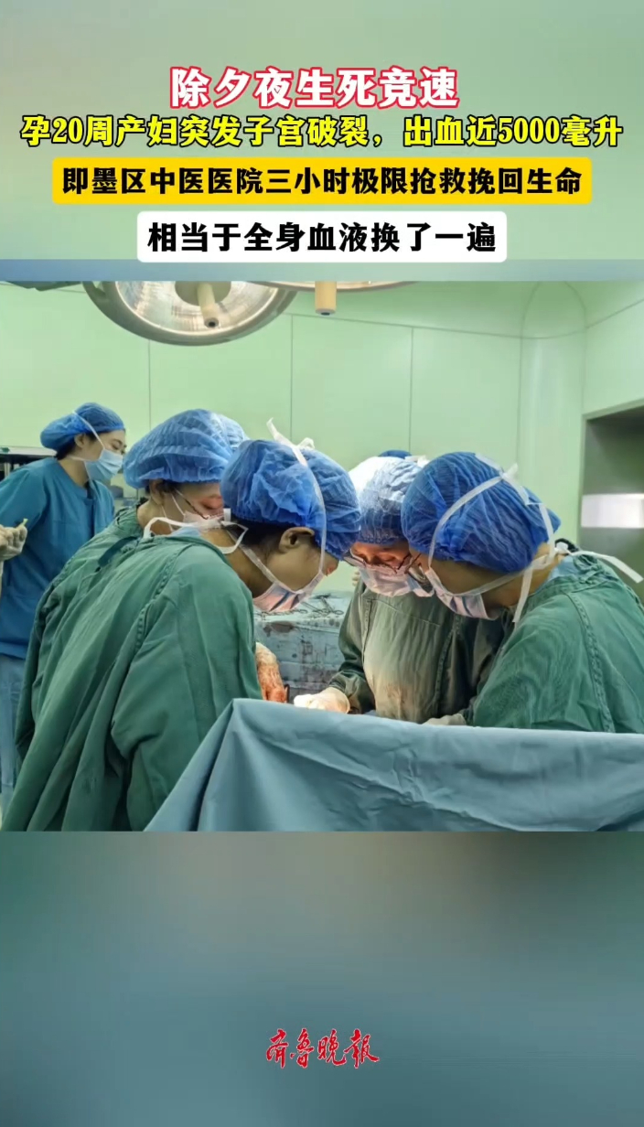果然视频丨孕妇突发子宫破裂出血五千毫升,医院极限抢救挽回生命齐鲁晚报·齐鲁壹点客户端 16:38原创2月16日除夕夜,即墨一名怀孕20周孕妇突发子宫破裂,腹腔内出血近5000毫升。即墨区中医医院多学科团队三小时极限抢救,成功从鬼门关抢回生命。 (齐鲁晚报·齐鲁壹点 宋祖锋)