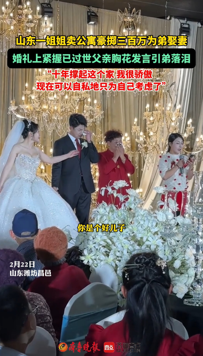 果然视频|姐姐卖公寓为弟娶妻,紧握过世父亲胸花发言引泪目大众报业·齐鲁壹点 16:342月22日,山东潍坊昌邑一场婚礼上,新郎姐姐手握过世父亲胸花上台发言,引弟弟落泪。2月24日,新郎姐姐告诉齐鲁晚报·齐鲁壹点记者,其父六年前去世。这些年来自己一人支撑着家庭。这次弟弟结婚她花费三百多万,还把一套小公寓卖了。“我赚的钱就是我家的钱,弟弟花得合情合理,往台上走的时候,我的腰杆挺得直直的,把爸爸的脸面挣回来了。“ 齐鲁晚报·齐鲁壹点 田思敏