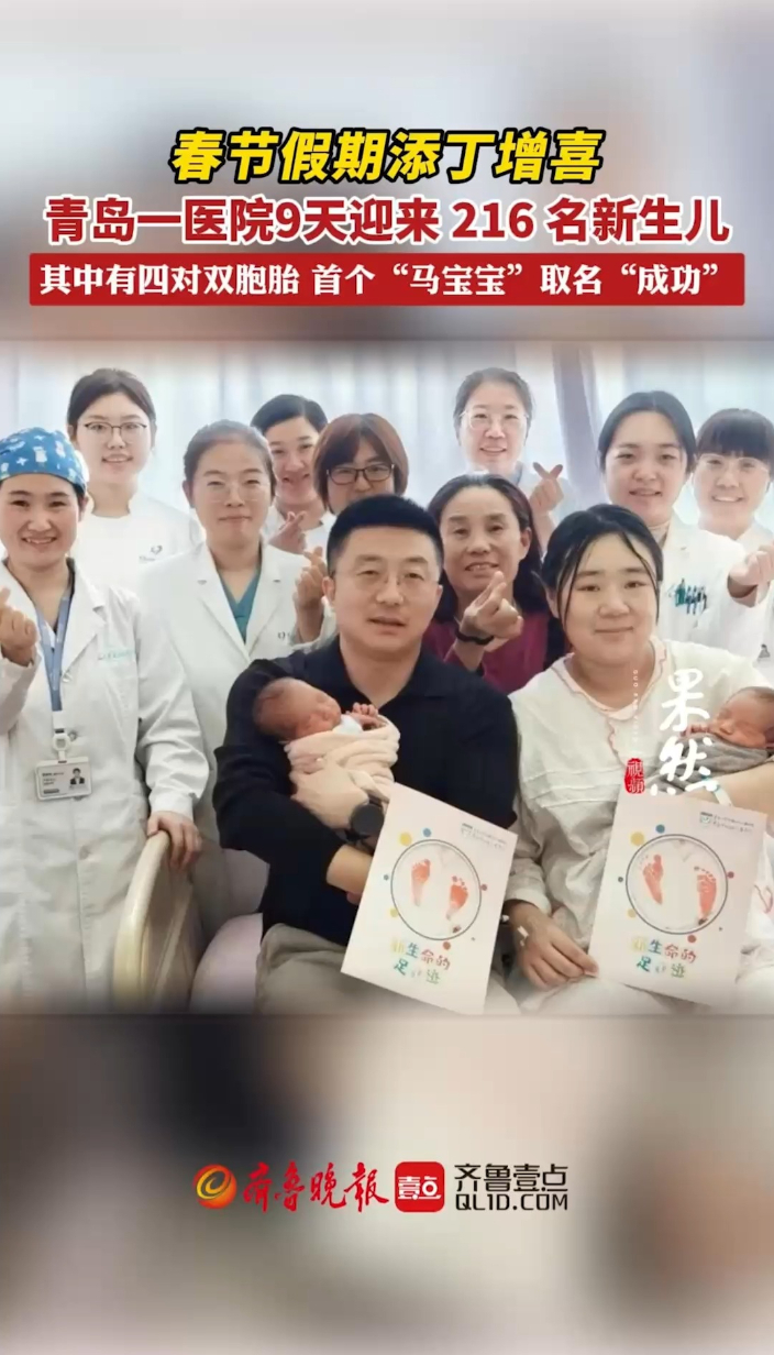 果然视频丨马宝宝“成功”报道!青岛一医院9天迎216名新生儿齐鲁晚报·齐鲁壹点客户端 16:38原创2月15日至23日,共有216名新生儿在青岛市妇女儿童医院平安降生,为一个个家庭添丁增喜。其中,4对双胞胎“扎堆”而至,更是将这份喜悦加倍放大。正月初一0点46分,医院首个“马宝宝”出生,父母为其取名“成功”,寓意“一马当先,马到成功”。 (齐鲁晚报·齐鲁壹点 刁明杰)