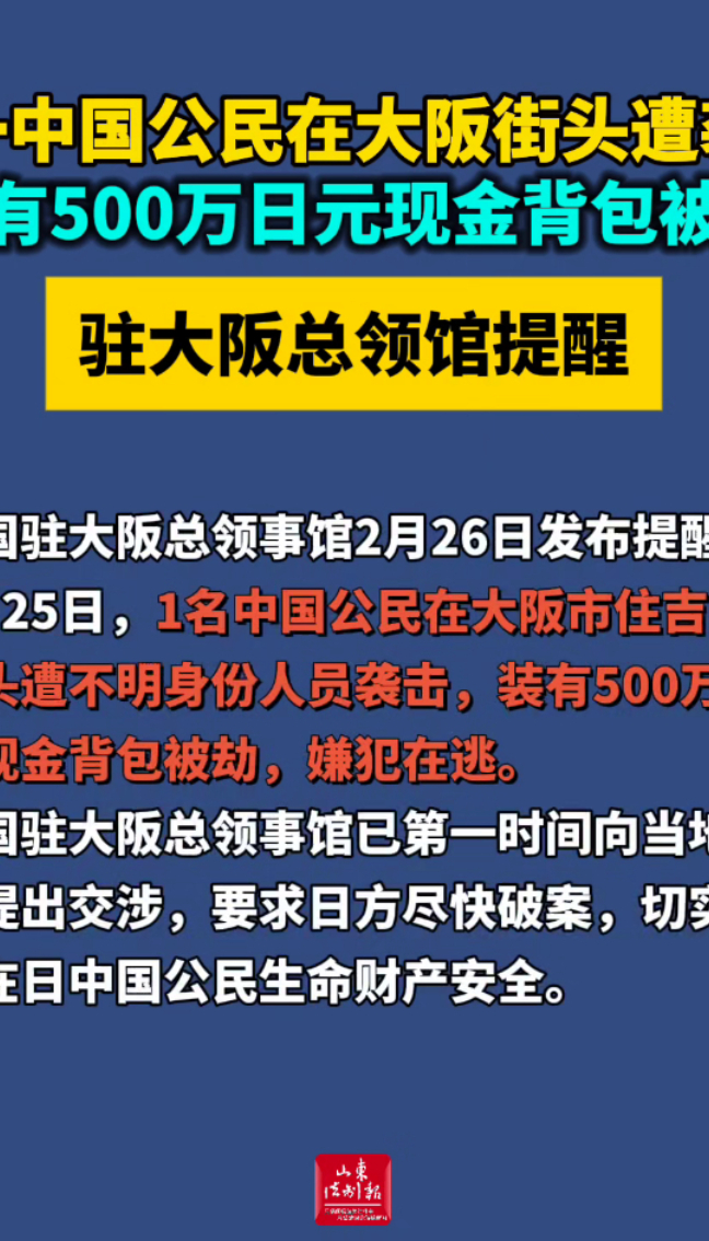 中国驻大阪总领事馆2月26日发布提醒:2月25日,1名中国公民在大阪市住吉区街头遭不明身份人员袭击,装有500万日元现金背包被劫,嫌犯在逃。中国驻大阪总领事馆已第一时间向当地警方提出交涉,要求日方尽快破案,切实保护在日中国公民生命财产安全。