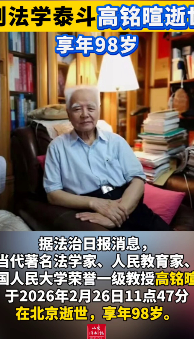 刑法学泰斗高铭暄逝世,享年98岁 18:11 大众新闻·山东法制报 微信扫码扫码下载客户端据法治日报消息,当代著名法学家、人民教育家、中国人民大学荣誉一级教授高铭暄,于2026年2月26日11点47分在北京逝世,享年98岁。