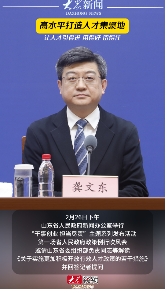高水平打造人才集聚地,让人才“引得进、用得好、留得住”大众新闻 18:31原创2月26日下午,山东省人民政府新闻办公室举行“干事创业 担当尽责”主题系列发布活动第一场省人民政府政策例行吹风会,邀请山东省委组织部负责同志等解读《关于实施更加积极开放有效人才政策的若干措施》,并回答记者提问。(大众新闻记者 高广超 杨烨莹 策划 马玉峰 陈巨慧)