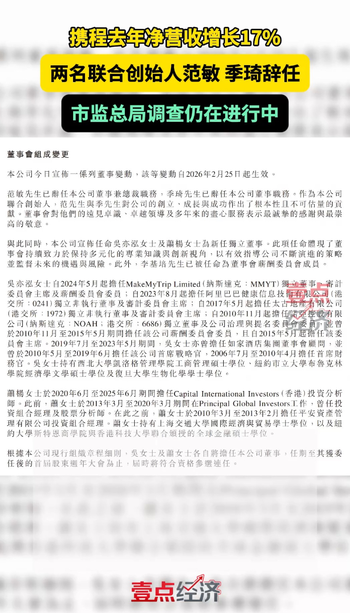 壹点企讯|携程去年净营收增长17%,两名联合创始人辞任 19:55 大众报业·齐鲁壹点 微信扫码扫码下载客户端2月26日,携程集团公告2025年第四季度及全年未经审计的财务业绩,同时公布公司董事会变动情况。携程公告显示,范敏已辞任公司董事兼总裁职务,季琦已辞任公司董事职务。同时,公司宣布任命吴亦泓及萧杨为新任独立董事。