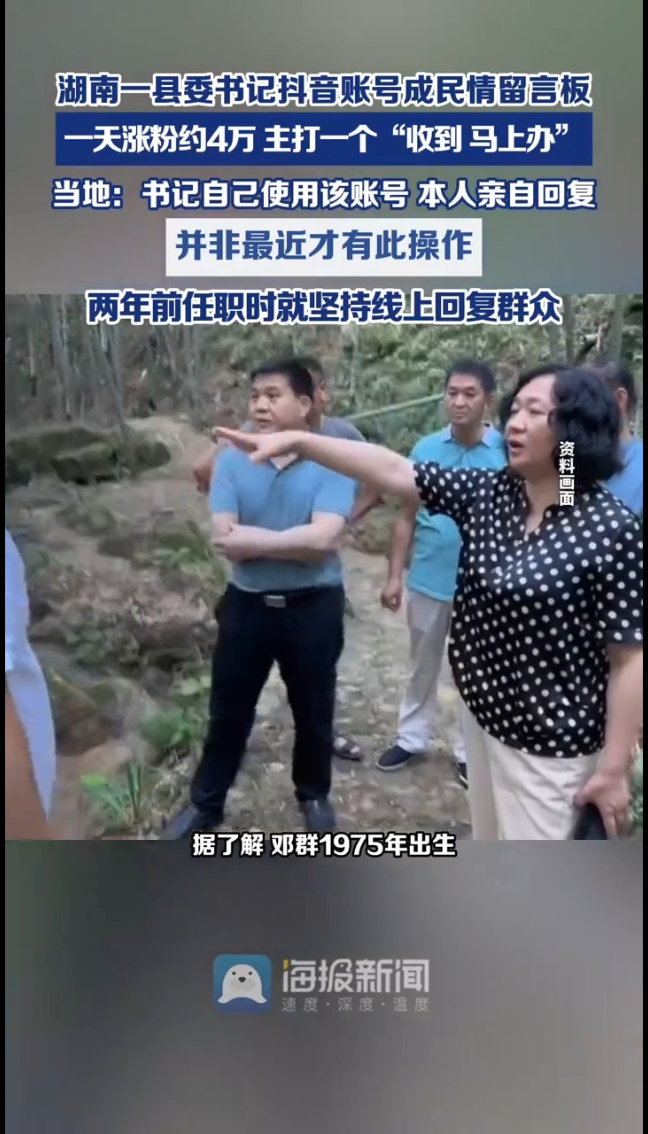 这两天,湖南永州蓝山县委书记,邓群的个人抖音账号彻底火了,被老百姓当成了“民情留言板” ,一天涨粉约4万,目前粉丝达7.3万。