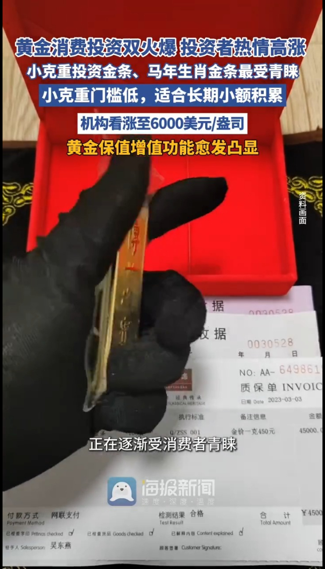10克、20克的小克重投资金条、马年生肖金条正在逐渐受消费者青睐。2月25日,国际金价高位波动,现货黄金盘中突破5200美元/盎司。与此同时,国内黄金消费市场热度持续高涨,春节期间高端古法黄金、一口价产品、投资金等备受关注。