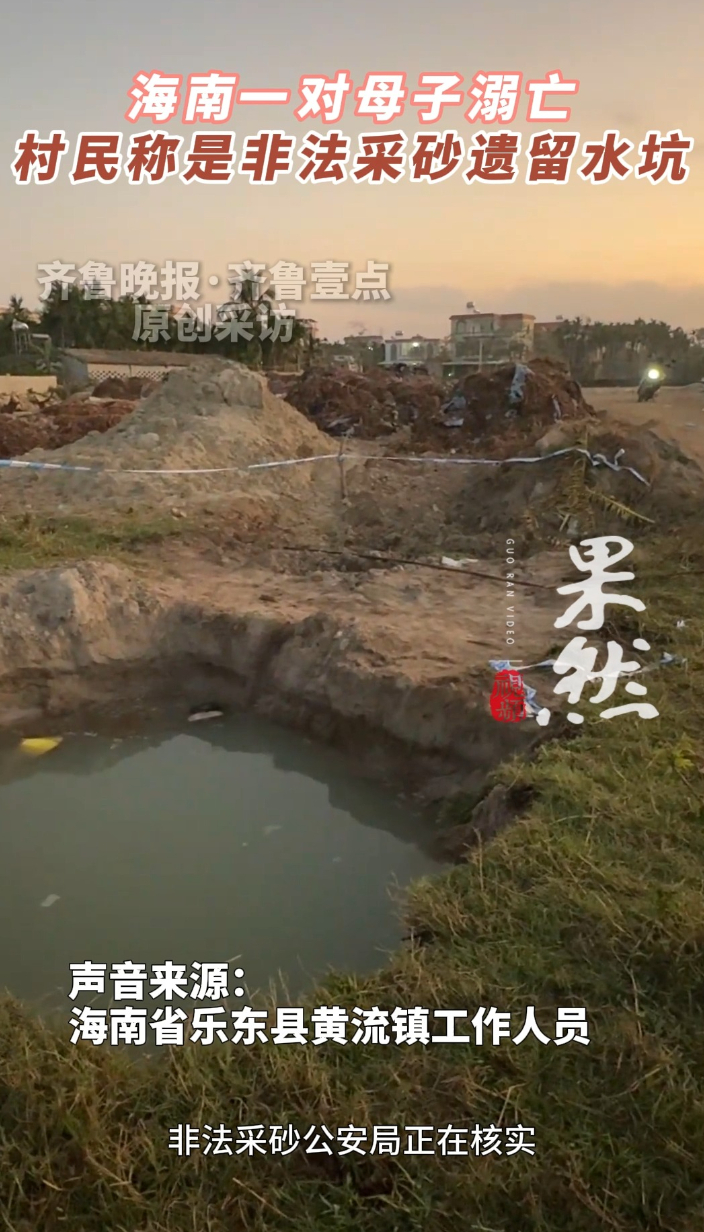 果然视频|海南一对母子溺亡,村民称是非法采砂遗留水坑齐鲁晚报·齐鲁壹点客户端 14:41原创2月26日,有网友在社交平台发布消息称,海南省乐东县黄流镇赖元村一对母子不幸溺亡。网友表示,事发地为村民非法采砂遗留的水坑,母子二人路过时不慎坠入。镇政府回应,公安部门正对非法采砂情况进行核实。(齐鲁晚报·齐鲁壹点记者 王开智)(齐鲁晚报·齐鲁壹点爆料电话:0531-85193656;邮箱:405617016@qq.com)