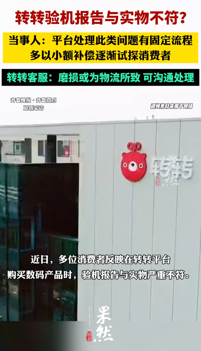 果然视频|“半老徐娘”假装“二八佳人”,转转验机报告太注水齐鲁晚报·齐鲁壹点客户端 15:05原创“我已不止一次遇到这种情况了,实物与验机报告根本不一致。”近日,多位消费者反映,在在转转二手交易平台购买数码产品时,平台验机报告与实物严重不符。消费者表示,平台此类问题频发,“处理方式趋于固定流程。”(齐鲁晚报·齐鲁壹点爆料电话:0531-85193656;邮箱:405617016@qq.com)(齐鲁晚报·齐鲁壹点 杜嘉文 李苗)