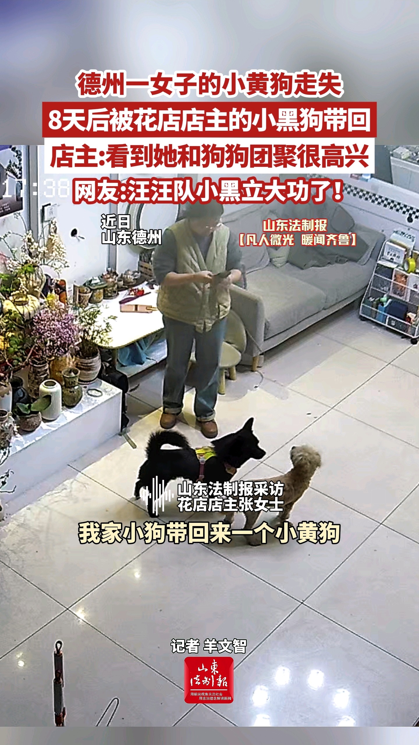 德州一女子的小黄狗走失,8天后被花店店主的小黑狗带回,店主:看到她和狗狗团聚很高兴,网友: 汪汪队小黑立大功了!山东法制报 | 16:55 原创山东法制报 微信扫码扫码下载客户端近日,德州临邑一名女子的小黄狗走失,她便在附近商铺逐一发放寻狗启事。8天后,附近花店店主张女士的小黑狗将走失的小黄狗带回店里。张女士第一时间与女子核实确认信息后,女子当晚赶到店里接回了狗狗。网友表示:“汪汪队小黑立大功了!”(大众新闻·山东法制报记者 羊文智)