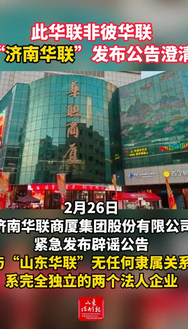 2月26日,济南华联商厦集团股份有限公司紧急发布辟谣公告,与“山东华联”无任何隶属关系,系完全独立的两个法人企业。