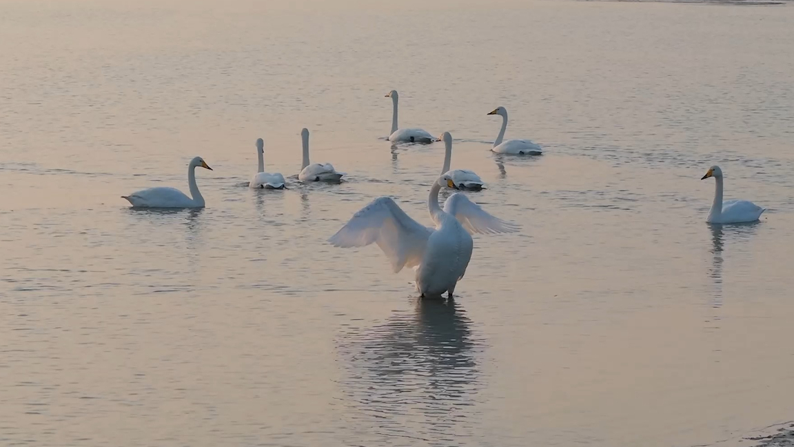 万里北迁在即,大天鹅振翅练飞