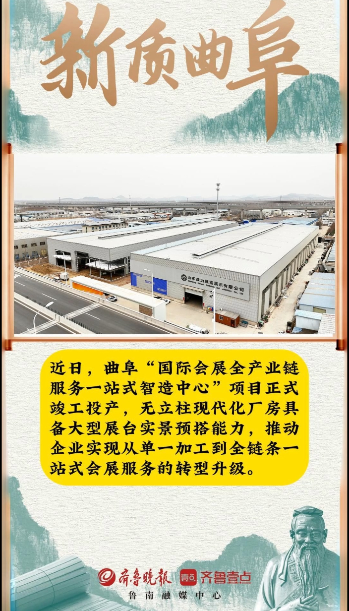 果然视频·新质曲阜|赋能曲阜产业升级,这一重点项目竣工投产大众报业·齐鲁壹点 17:21近日,曲阜“国际会展全产业链服务一站式智造中心”项目正式竣工投产,无立柱现代化厂房具备大型展台实景预搭能力,推动企业实现从单一加工到全链条一站式会展服务的转型升级。(齐鲁晚报·齐鲁壹点 易雪 通讯员 孔雅玮)
