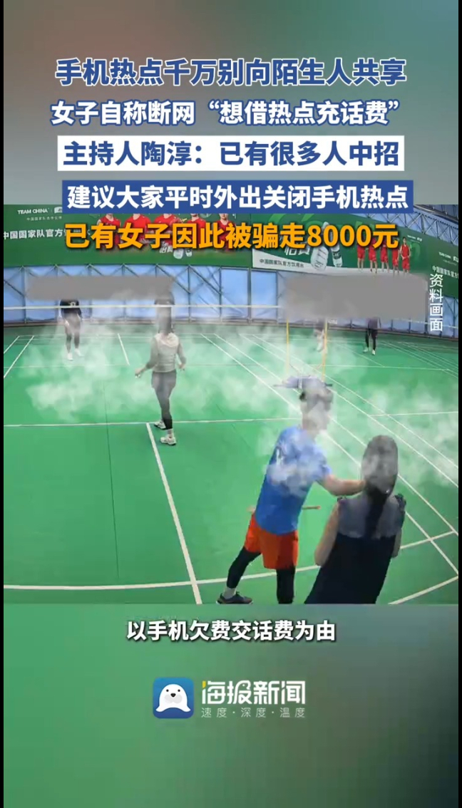 机热点千万别向陌生人共享!上海知名主持人陶淳称朋友遭遇新型骗局,他的朋友在球场遇到陌生女子,以手机欠费交话费为由,请求帮忙开启手机热点,朋友察觉对方言辞、手机时间异常,果断拒绝才躲过陷阱。
