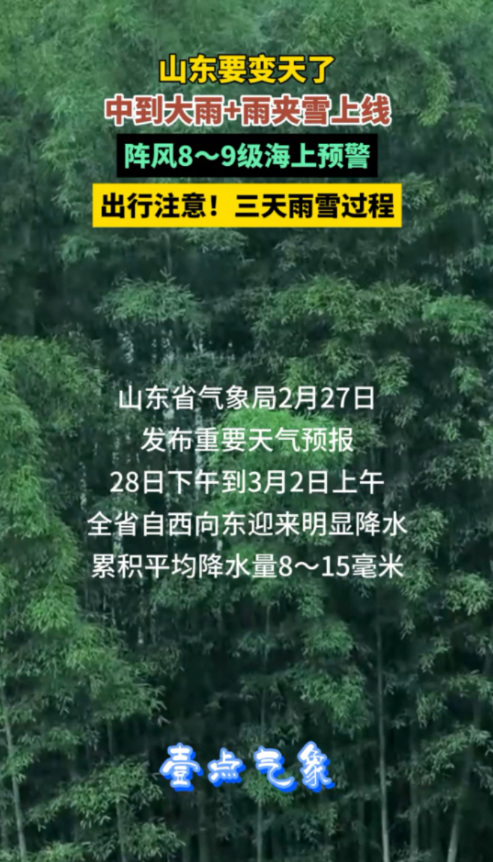 山东大范围雨雪即将上线!28日下午到3月2日上午,全省自西向东迎来明显降水,累积平均降水量8~15毫米。