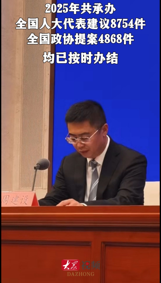 国务院新闻办新闻局副局长、新闻发言人周建设:2025年,国务院各部门坚持以习近平新时代中国特色社会主义思想为指导,把建议提案办理工作与贯彻落实党中央、国务院决策部署具体任务相结合,与本部门业务工作统筹谋划一体推进,共承办全国人大代表建议8754件,全国政协提案4868件,分别占建议、提案总数的95.6%、97.3%,均已按时办结,代表委员对办理工作表示满意。