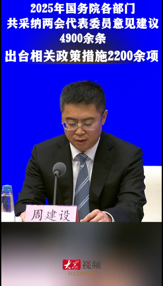 2025年国务院各部门共采纳两会代表委员意见建议4900余条,出台相关政策措施2200余项大众新闻 18:37原创国务院新闻办新闻局副局长、新闻发言人周建设:各部门共采纳代表委员所提意见建议4900余条,出台相关政策措施2200余项,在优化国家发展战略布局、助力现代化产业体系建设、推动更大力度稳投资促消费、激发高质量发展动力活力、加力解决民生领域痛点难点问题等方面取得新的工作成效。(大众新闻记者 董婉婉 张焕辰 北京报道)