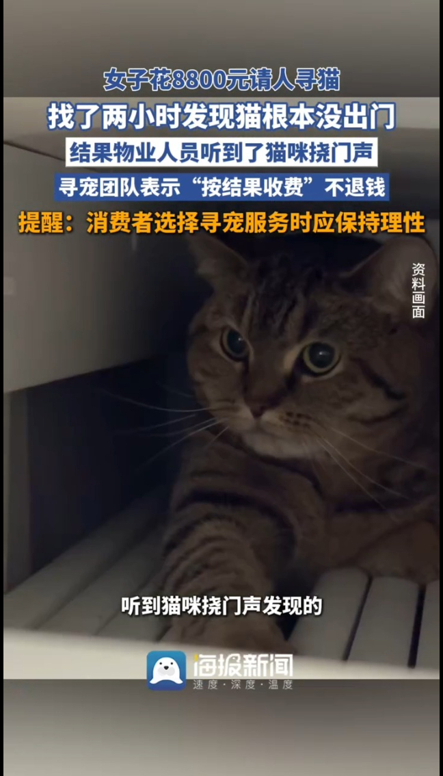 主播说|女子花 8800 元请人寻猫,找两小时才知猫未离家,团队按结果收费不退款